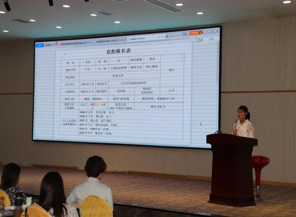 公司成立競拍領(lǐng)導小組,堅持“公開(kāi)競拍、平等競爭、擇優(yōu)錄取、注重實(shí)績(jì)”的原則,鼓勵員工毛遂自薦、積極報名。競拍店長(cháng)依次上臺分別從管理門(mén)店2021年度經(jīng)營(yíng)收入目標、競拍上崗后的工作思路、設想及經(jīng)營(yíng)措施等方面進(jìn)行演講。
