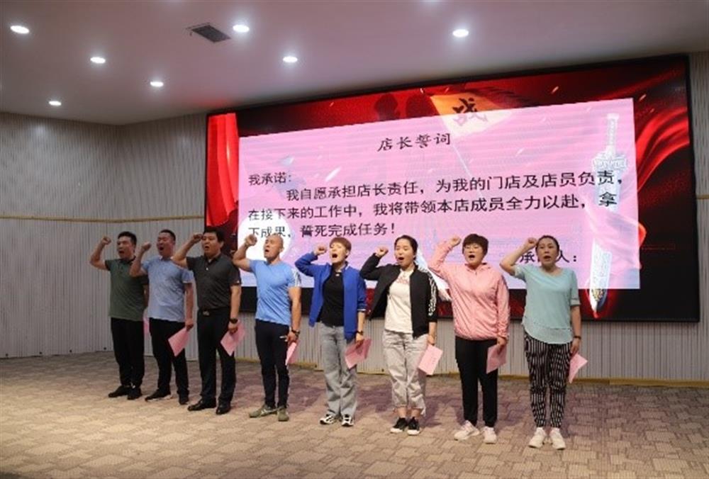 為激發(fā)全體員工齊心協(xié)力、共同奮進(jìn)的信心和目標既定、勢必達成的決心,以釘釘子精神狠抓落實(shí),開(kāi)創(chuàng )工作新局面,在競拍活動(dòng)中開(kāi)展激人奮進(jìn)的軍令狀簽署儀式?,F場(chǎng)77名店長(cháng)紛紛簽署軍令狀,2021年度經(jīng)營(yíng)結束后,根據現管門(mén)店收入完成情況,對競拍考核合格者予以晉升。